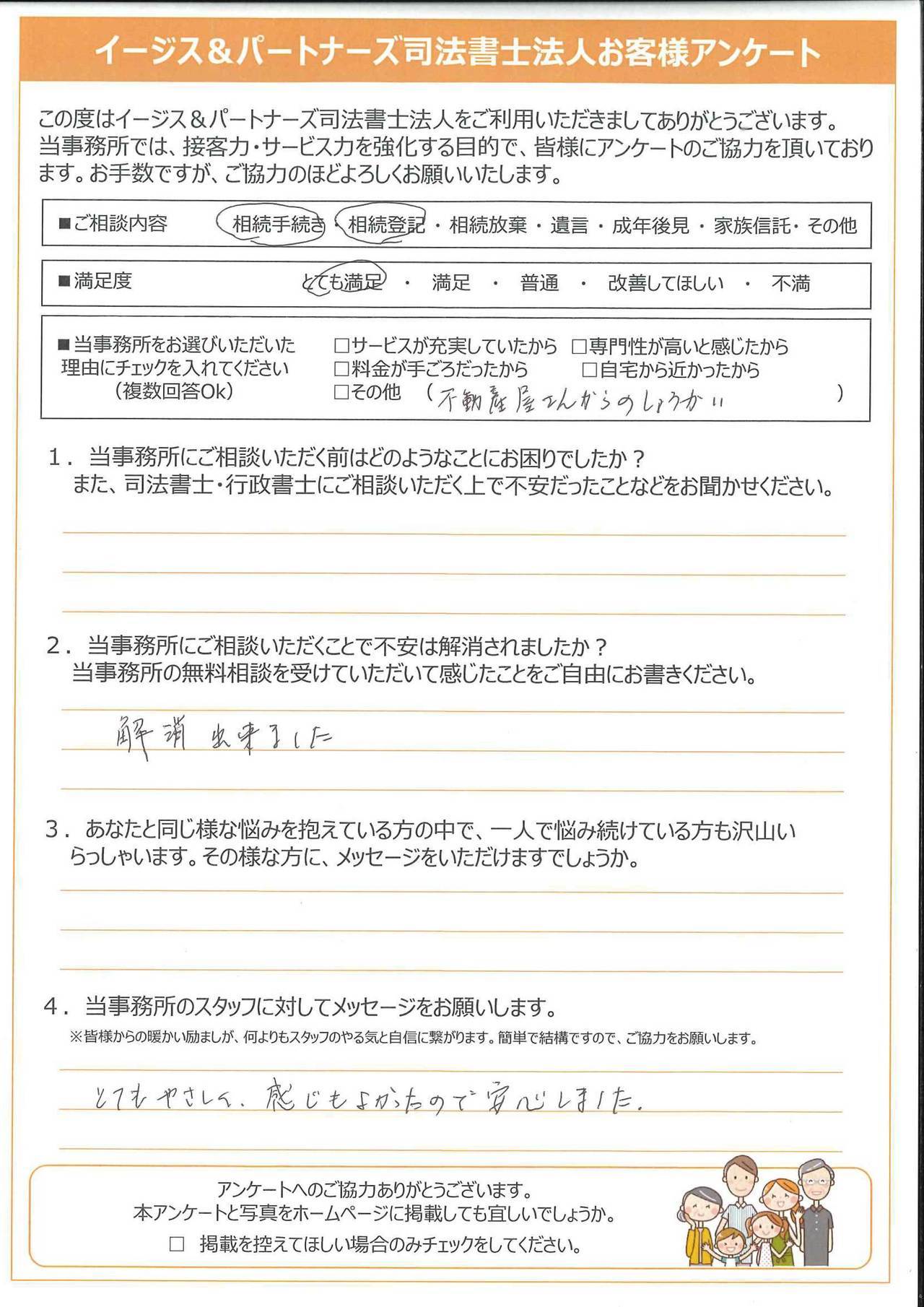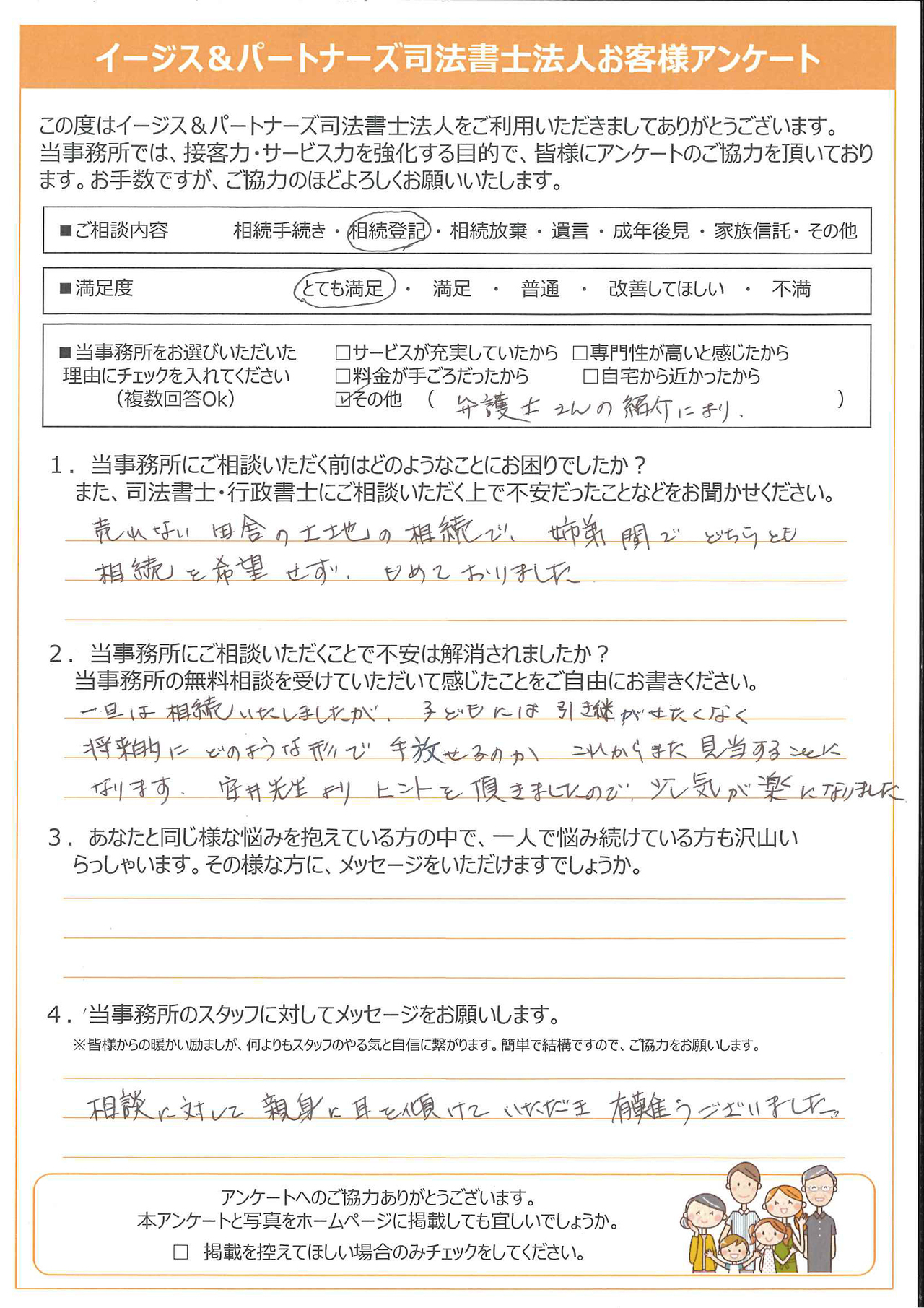 相続登記は自身でもできるのですが、煩雑なため戸惑っていました。迅速かつ丁寧な対応に感謝しています。ありがとうございました。たいへん助かりました。