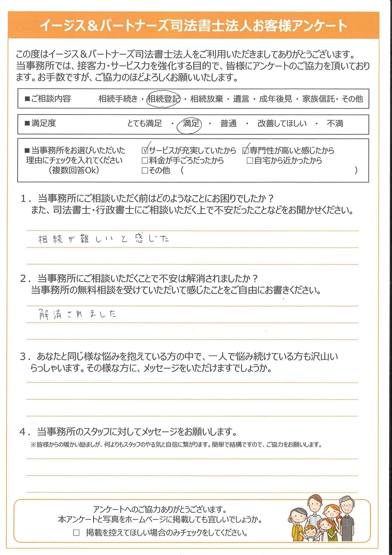 今回は、複雑な相続についてご相談を致しましたが、わかりやすい説明と迅速な対応に、大変満足しております。