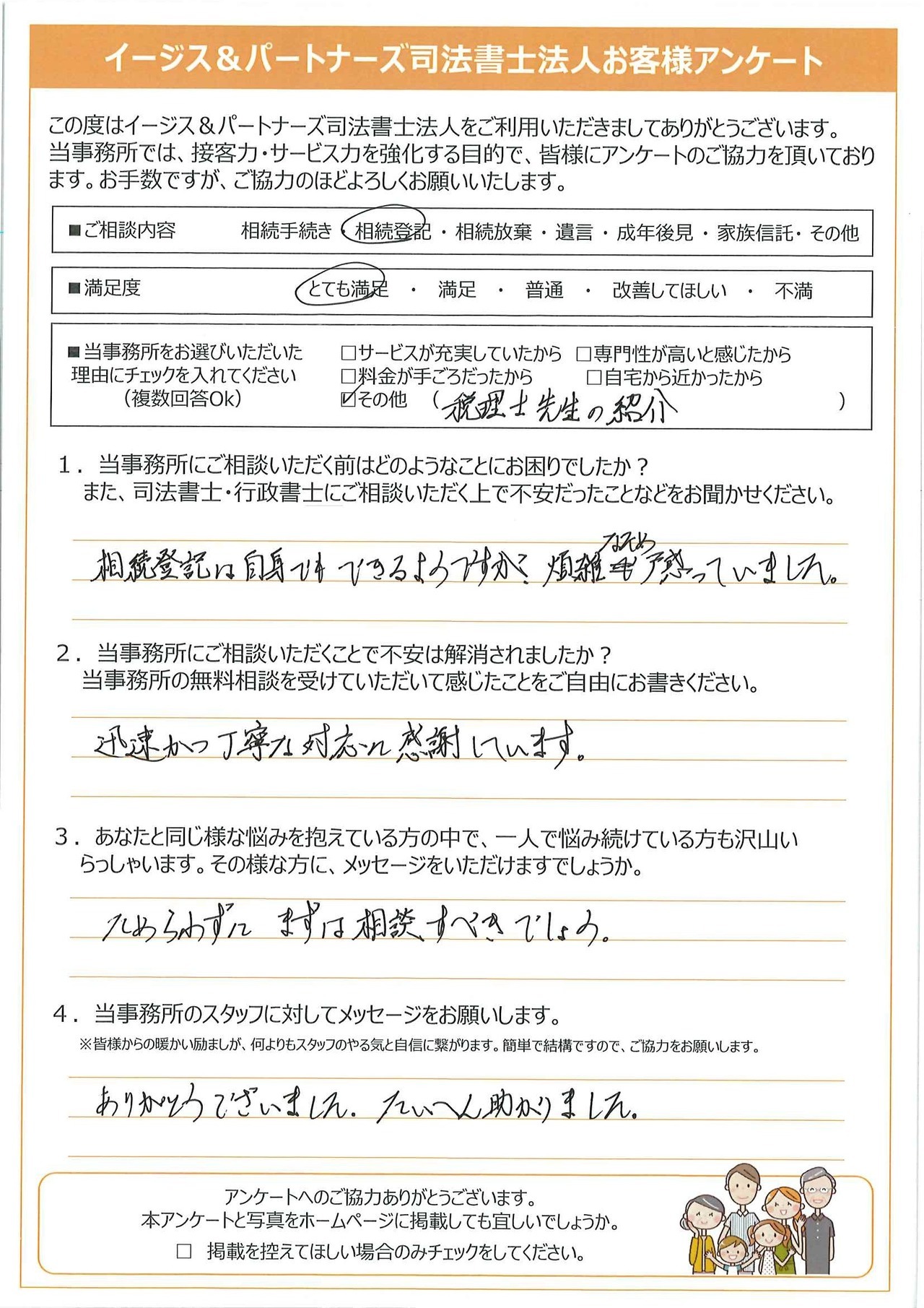 迅速な手続き、丁寧で分かりやすい説明が良かったです。所員の皆様も、明るく気持ちの良い対応をしていらっしゃいます。安心して手続きを完了することができました。本当にありがとうございます。今後とも宜しくお願い申し上げます。
