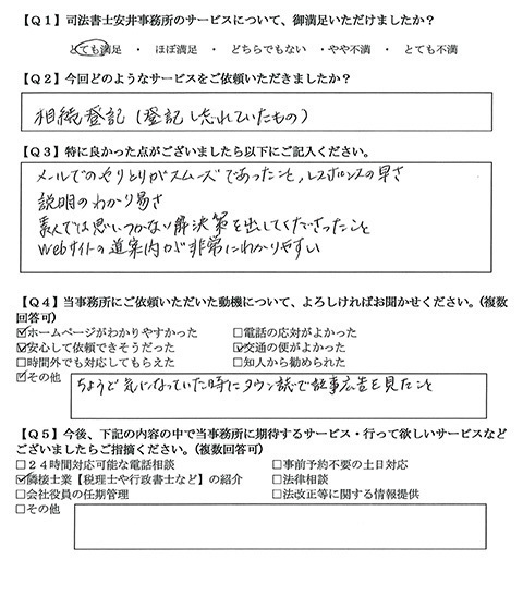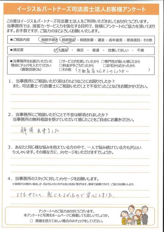 迅速な手続き、丁寧で分かりやすい説明が良かったです。所員の皆様も、明るく気持ちの良い対応をしていらっしゃいます。安心して手続きを完了することができました。本当にありがとうございます。今後とも宜しくお願い申し上げます。