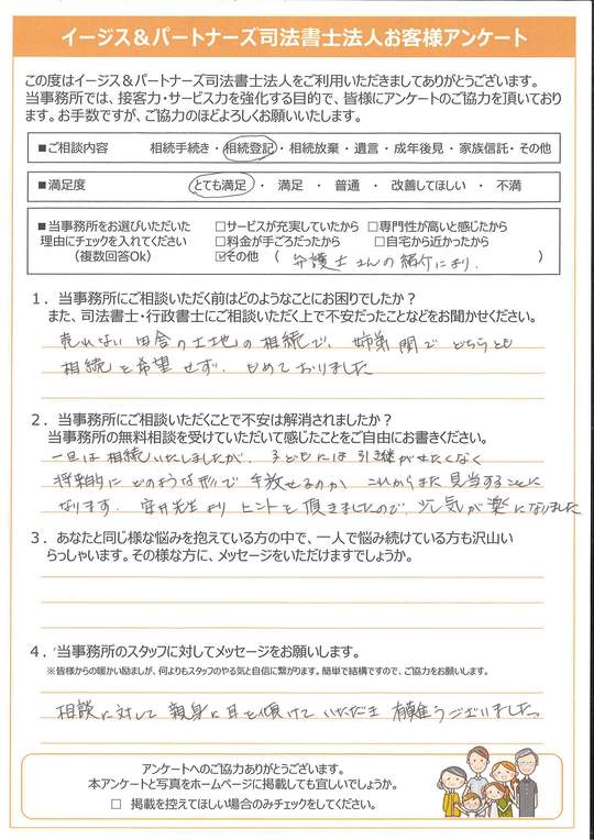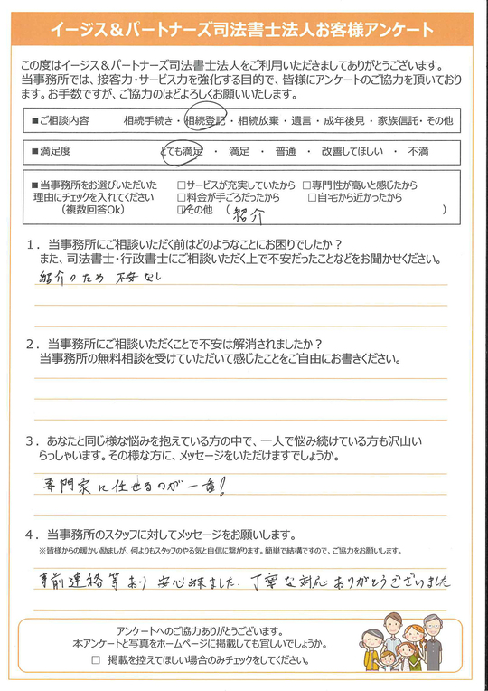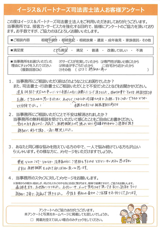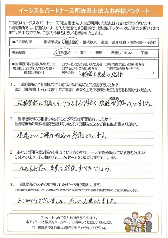 相続登記は自身でもできるのですが、煩雑なため戸惑っていました。迅速かつ丁寧な対応に感謝しています。ありがとうございました。たいへん助かりました。