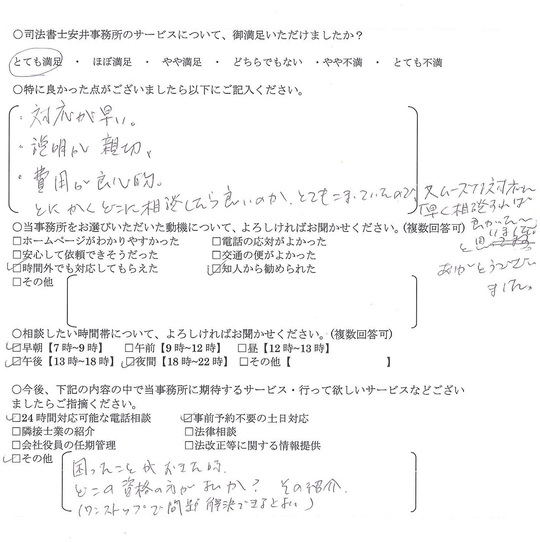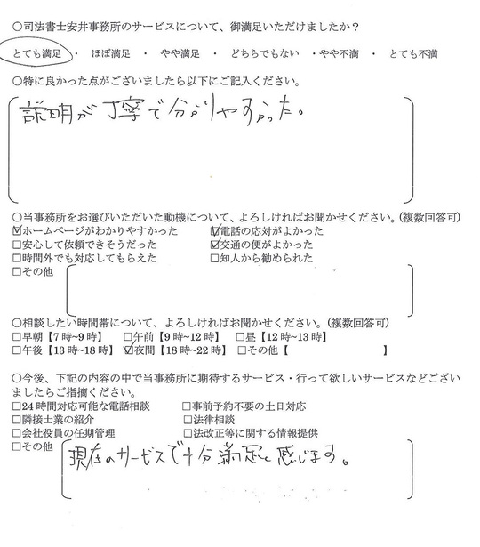良かった点:森様に依頼させて頂きましたが迅速な対応でとても安心できました。メールに対しての回答も素人に理解しやすい内容でしたし、手続き前後工程についてもわかりやすく話して頂き感謝しております。