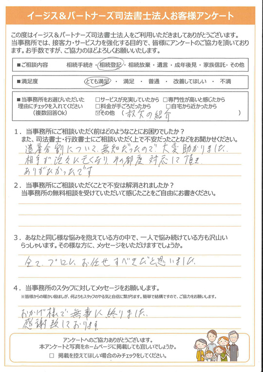 今回は、複雑な相続についてご相談を致しましたが、わかりやすい説明と迅速な対応に、大変満足しております。